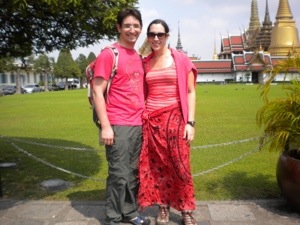 The Grand Palace was a 20 minute walk away, through a riverside university campus and bustling streets. In order to enter the palace grounds, one must dress modestly – shirts with sleeves and pants or skirt below the knee. As this was our first temple visit, we weren’t quite sure how strict the dress code was, so Jordan (on advice from the guesthouse staff) brought along a long sleeve shirt, a sarong to wrap around her, and socks and shoes. The Grand Palace was indeed a sight to see, with intricate buildings laden with gold leaf, and many statues. The main attraction is the Temple of the Emerald Buddha, which was smaller than we had imagined, though perched atop a very impressive alter of gold. Many tourists were praying there, and platters of offerings were full at the front of the room. All who enter must remove their shoes at the steps of the building, and when sitting in front of the Buddha must be cross-legged or sit with feet behind them – don’t point your feet toward the Buddha!