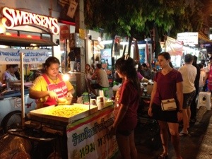 The Rabbi invited various guests to join in sharing a story or song with the crowd (which was at this point about 70 people). More challah and salads were served, and eventually (2 hours later) yummy chicken soup made its way to our table. Eventually (just before midnight), as we were about to leave, the main course was served – chicken, rice, and a kugel. At this point there were about 50 people there, who all enjoyed the benefits of their perseverance. From conversations with out her guests, it seems this is the norm at Chabad in Bangkok. Finally, confused, well fed, and ready for bed, we made our way through the bustling street back to our guesthouse.