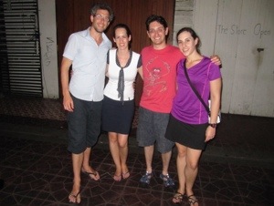 As the sun set over Rambuttri Rd in Bangkok, we headed to The Chabad house, where we joined another 150 or so Israeli travelers for Kabbalat Shabbat services followed by a dinner. Most of the people there were young backpackers, such as ourselves, and there were also a few older visitors. We immediately scouted out some new friends, Miri & Davidi, a couple our age on a two week vacation. Dinner was rather quick, and we were surprised that there wasn’t a true main course, only soup, salads and challah. We remained after the meal and relaxed with our new friends, and eventually made our way downstairs to the Rabbi’s residence (one floor below) for an “Oneg Shabbat”. We joked that perhaps the main course would be served there.