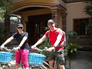 On a tip from Justin (redhead Rastafarian from Kentucky who we met Friday night), a vegan, we headed to a local Khmer vegetarian restaurant, called Vitking House. Located outside the tourist area, we biked over (took us a few wrong turns until we found it) and sat down on cushions at a low table. We ordered fried straw mushrooms (tasted just like shwarma meat), dumplings with soy meat, and Chinese noodle hot plate with egg and soy ham. Everything was better than delicious, and we wished we had discovered it sooner. After dinner we went back to Old Market / Pub Street (the tourist area) for some yummy ice cream and to pick up a bag of mixed taro/yam/banana chips (that Jordan had been eyeing since Thursday).