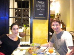 At around 3:30pm, we hopped back on our bikes and headed into town (a 45 minute ride) to buy provisions for Shabbat. We stopped to buy some fruit along the side of the road – longan, rambutan, and langsat (it took us a combined hour to figure out what this fruit was, even though we had some in our bag). In the center of town, we found a western-style large supermarket, but before going in opted to explore a little in search of a snack – and it’s a good thing we did! Only a few steps away, we caught a Hebrew word out of the corner of our eye: Falafel! We excitedly walked inside and were greeted by a friendly Khmer woman, Sou-Kay who immediate invited us to Shabbat dinner. Caught a little off guard, we asked about the owner who we were told would be back shortly. We decided to go to the supermarket to get the food we would need for Shabbat after feeling assured that Shabbat dinner would be taken care of. We returned to Mother Earth Falafel to meet Kobi, the owner – an Israeli guy who moved to Cambodia 7 years ago. He was friendly and happy to have us join his weekly Shabbat dinner. Relieved and excited, we went back to our guest house to take a quick dip in the pool and change our clothes before heading back to a lovely Shabbat dinner.