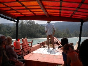 We spent the next four hours napping in the shade, snorkeling and swimming in the warm clear-blue water, and enjoying a lunch of fresh fish grilled on the spot by the staff, rice, grilled veggies, baguette, and pineapple. Recharged from a relaxing afternoon, we all got back on the boat for a two hour journey to the mangrove forest that covers the entire shoreline in this area. It was cool to see how they grow right out of the water, their roots reaching down like a hundred fingers into the mud. We learned that mangroves help stop coastal erosion and can even absorb the force of a tsunami. We walked through the forest on a boardwalk, which gave us the opportunity to be surrounded by the trees, and climbed a tall observation tower to see the view just before sunset, looking out over the forest.