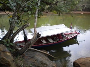 On Thursday morning, we woke up a few minutes early and went for a very nice breakfast at Cafe Laurent across the street – decidedly the nicest place in town. We enjoyed fancy coffee, beautifully presented, and some chocolate croissants (pricey at $7 total), while looking out over the river. Feeling a little more human, we crossed the street back to our hotel and hopped on the Eco Tours tuktuk, which took us a bumpy 10 minute drive to a small boat docked at the end of a random dirt road. Along with one other tourist, Teamo from Finland, and two staff members, Taan the guide and his uncle Mao, we motored into the river and through mangrove-lined waterways inland towards the mountains. About an hour later we arrived at our spot – a rock on the side of the river – and hopped off the boat.