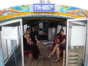 On Monday morning, after a breakfast of pancakes and eggs at our hotel in Hoi An, we got on the bus to Hue, Vietnam’s ancient imperial city. This was a trial-run on a sleeper bus, with bunk-bed-like reclined seats staggered throughout, for this short 4-hour ride ($4 each). We arrived around 12:30 and walked the 15 minutes to our hotel (even with the heavy packs on our back, there was no way we were going to be ripped off by those guys who met the bus with their fake taxis). After dropping off our stuff at the “Friendly Hotel” ($17/night), it was time to feed Jordan, so we set off in search of lunch. We wound up at Hot Tuna, and it’s a good thing we did!