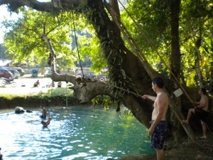 Aching from our sunburns, we had a lazy morning while we waited for peak heat to pass. We enjoyed shmoozing with the hotel owner, Michael, a Singaporean with a very interesting outlook on Laos, its people and its future. Around 2pm, we found a tuktuk to take us to the Blue Lagoon ($12.50 + $2.50 entrance fee, 20 dusty minutes) – a beautiful blue-water river lagoon which the local village improved, gated and turned into a tourist attraction complete with a rope swing, tree branch high-dive, Tarzan rope jump, cabanas and a restaurant. It felt great to cool off in the water and relax in the shade for the afternoon. Dinner was mediocre falafel and pasta (guess who has been here in droves?) at an indescript place on the main road ($9). We finished off the night with tea and a peanut butter-chocolate bun at the local bakery ($2).