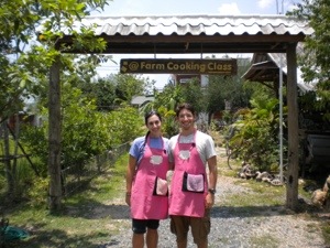 We pulled up in front of Tesco Lotus Express (a large minimart), but then ducked in the alley behind it and found ourselves in a hidden local market. Smaller and calmer than many such markets we’ve seen, it was pleasant to view the offerings. Fon explained about different kinds of rice, noodles, curries, spices and tofu. We had a few minutes to wander around while the “housekeeper” (Fon’s assistant who accompanied the day) picked up a few more ingredients for our dishes, and we all piled back into the van for the 30 minute drive to the farm.