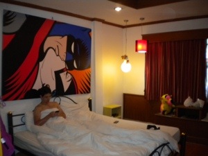 At 1pm, we boarded the bus which took us to the ferry pier at Donsack for the one hour crossing. We finally arrived in Koh Samui and got a songthaw to take us to Chaweng on the other side of the island ($5). We arrived at Chaweng around 3:30pm and went to the guesthouse which we had reserved in advance. One quick look at the room and we knew we did not want to stay there, so we put our packs back on our backs and walked down the street in search of a more suitable guesthouse. Lucky for us, Martin from Akwa guesthouse flagged us down and offered us a room. One quick look and we knew this place was great – decorated in comics style and with a lot of personality ($20.50 / night). By now, it was practically candle lighting time so we showered, changed, and ran over to Chabad about ten minutes down the street just as Shavuot dinner was beginning.