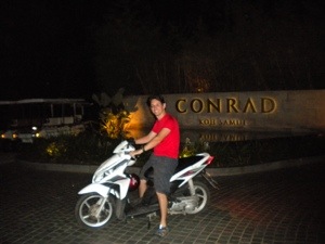 We had made plans to hang out with Miriam and Anshel on Thursday afternoon at the Conrad, their $1000/night resort (they used points – something for us to aspire to) on the other side of the island. We rented a motorbike from Martin at Akwa ($6.66 for the day plus $3.33 in gas). Happy to be mobile, we drove out on the main street where we found a cute French patisserie for breakfast (two coffees, eggs, baguette and a chocolate croissant for $ 6). From there, we drove around the island a bit in search of our next hotel and found Buddy Oriental Resort in Lamai Beach just south of Chaweng. We booked a room for two nights and arranged for a free pickup from Chaweng on Friday morning. After a quick stop to get snack at Tesco Lotus supermarket, we drove the half hour to the southwest tip of the island. Having passed the unmarked turn twice, we finally found the road block with white gloved guards leading up to the Conrad. Here we were, two backpackers on a dinky scooter carrying a supermarket bag with snacks and winding up the steep mountain road to a world class resort. About halfway up, the motorbike decided that this was too much for it and as though even it was laughing at us, it slowed to a stop on the steep incline. We both hopped off as Felix pushed the bike to the top of the hill. It’s not easy pushing a motorbike up the hill.