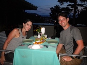 After gorging ourselves on breakfast, we headed down the hill in our bathing suits to Kata beach, where the waves were out of control and the beach chairs were overpriced. We hung our dry-bag and towels on a tree and played in the water. Felix enjoyed challenging the waves and the undertow while Jordan snapped some photos. We then wandered around the bazaar shops, where Jordan bought a fun new bathing suit for $5 (she was very proud of this purchase) and we booked our ride to the airport for the next morning (a competitive 800 baht /$26), before our ride came to take us back to our favorite hideaway. We lounged by the pool and sipped a piña colada and a mai tai ($13.33) with a snack of nuts as the day wound down. Dinner began as we watched the sun set over the water, and we ate dinner at the hotel restaurant – for the veggie green curry and fresh spring rolls ($13). We tried to order ice cream for dessert, but the restaurant was out of ice cream (!), so we convinced Luis, the Costa Rican Guest Relations Manager to run us down to the minimart, which he happily did, and we got our Cornetto cones ($2) to make the night complete. On Tuesday morning we had a early breakfast, and our ride came promptly at 7:30am to drive us to the airport, a 75 minute drive to the northern tip of the island.