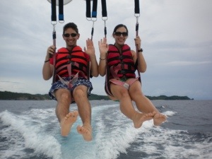 Just before sunset, we reported for our paraw sailing experience. The local version of a sailboat, the body of the paraw is very narrow, but it has a wide supporting structure. We climbed up and sat on the plastic wire netting suspended over the “wings” of the boat. As it glided over the water the waves lapped at our feet, and occasionally at our bottoms. The views of the water and island at sunset were gorgeous, and even though we were soaked (not having expected to get so wet), it was a lot of fun and a very unique experience. Bathing suits already wet, we spent some time in the warm beautiful water. We strolled along the beach, purchased some souvenirs, priced the next morning’s activity, and headed back to Ariel’s House for dinner. We shared a seared tuna salad (way overcooked) and a yummy veggie burrito ($8) and shared a banana peanut butter chocolate shake (yep – also included in our package). Even though much of the day was overcast and rainy, the photo-finish sunset and fun activities made it another awesome vacation day.