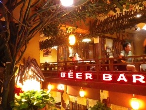 As we left the brewery, the rain began to fall and by the time we reached the main street it was a proper downpour. The pesky rain deterred us from finding the right bus, and we took a taxi ($2) back to our hotel for a rest. Tired and not feeling like walking in the rain, we hoped to find dinner nearby our hotel. We picked a random restaurant and entered a tree-house realm like no other. Down a winding wooden staircase was a multi-level wood creation, full of booths and grottos, accented by colorful twinkle lights. The waiter brought us to a large bright room with all sorts of sample dishes to choose from. Being a seafood town, there were also many interesting (some might say disgusting) sea creatures available in tanks around the edge of the room. We settled (through some written notes, English words and pantomime) on broccoli with mushrooms, spicy tofu, noodle soup and rice. Together with a pitcher of beer, it was way too much food, and yet the experience of this cool place was totally worth it ($13).